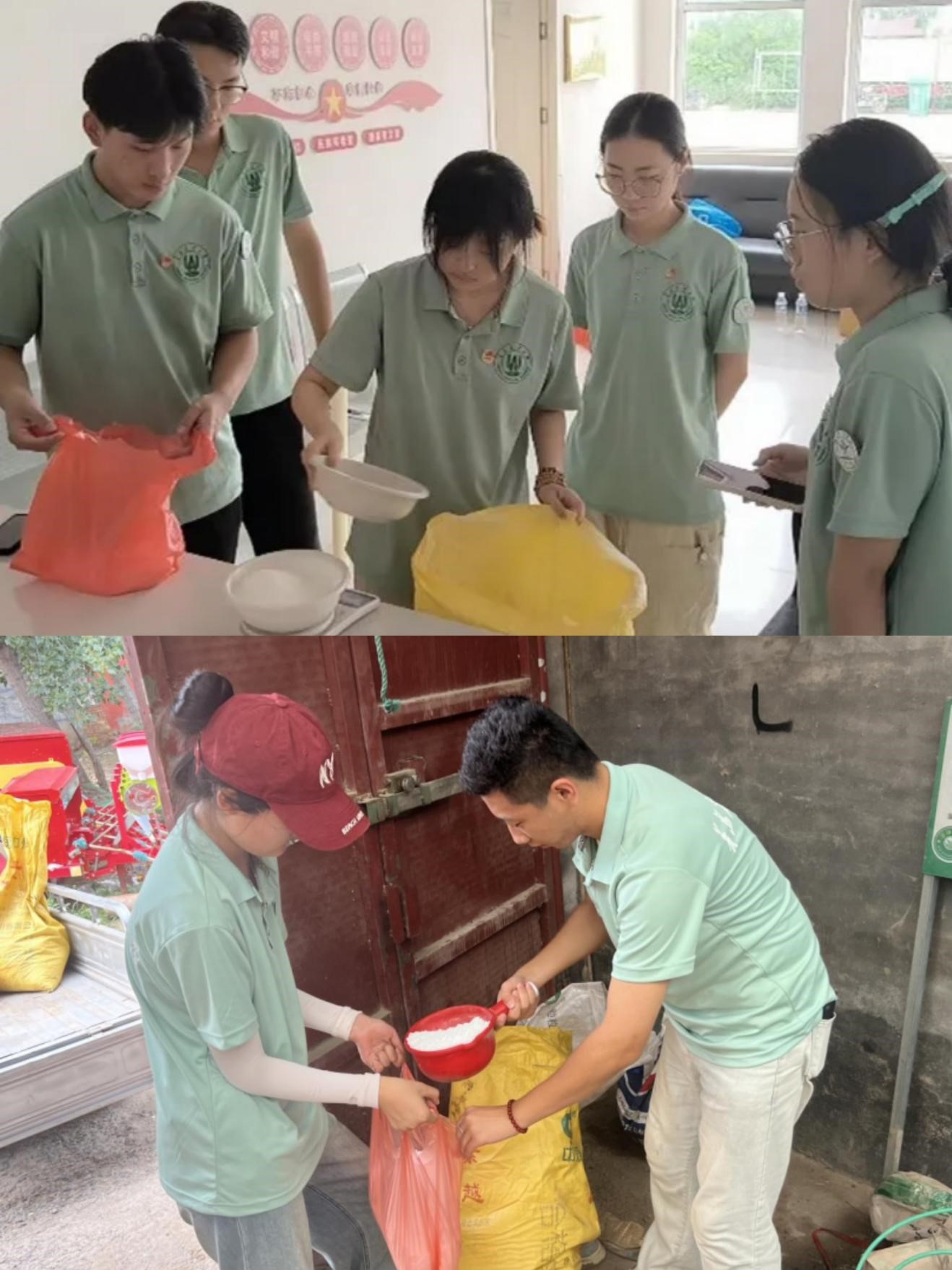 乡村是青年人干事创业的大舞台,田间是大学生学习成长的“实践教育课堂”。实践团队坚持主动自找苦吃的精神,直接参与田间劳作并协助记录测量数据工作。劳作实践前期,由学院派驻科技小院的研究生面向队员们进行了施肥作业技术培训,每天走进田间对玉米的长势情况进行观察,而后适时开展施肥作业。劳作实践中期,队员们分别在王木腿村、杨盘村试验田中完成了10亩夏玉米的施肥作业,是将在校课堂所学专业理论知识转化运用于农业生产实践的直接体现。劳作实践后期,实践队员照例完成每天日志的撰写。队员佟琪琪写道:“夕阳下,回望这片玉米地,感觉无比自豪,这段劳作经历磨练了吃苦耐劳的品质,虽然身体略感疲惫,但这份与土地紧密相连的情感,让我感到前所未有的充实和满足,也让我加强了对自然与土地的敬畏之心,对农业工作者的敬佩之心,并给予我持续奋进的力量。”队员王晓雪说:“第一次下田追肥,是一次亲近自然、体验农耕辛劳与乐趣的深刻经历。在这片玉米地里,追肥行进的每一步,都走出了我对农业生产新的认识。追肥过程中,我也终于知道一亩地到底有多大,这不单纯是书中666.67平方米的数字,这次的一亩地是我用脚一步步丈量的,每一步都有着体会与感悟,我切实体会到了农民们对土地的那份深情与执着。这种体验让我更加珍惜眼前的食物,理解了‘粒粒皆辛苦’的道理。”