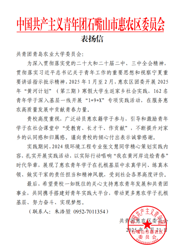 在2024至2025学年寒假期间,88858cc永利官网,88858cc永利官网响应校团委“青春为中国式现代化挺膺担当”社会实践活动的号召,鼓励学生返乡深入基层开展实践,2024级环境工程专业张文慧同学在实践过程中表现优异、贡献突出,收到了来自家乡宁夏回族自治区石嘴山市惠农区团委的一封表扬信,充分展现了资环学子在扎根基层中求真学问、练真本领、做实干家的责任担当和精神风貌。