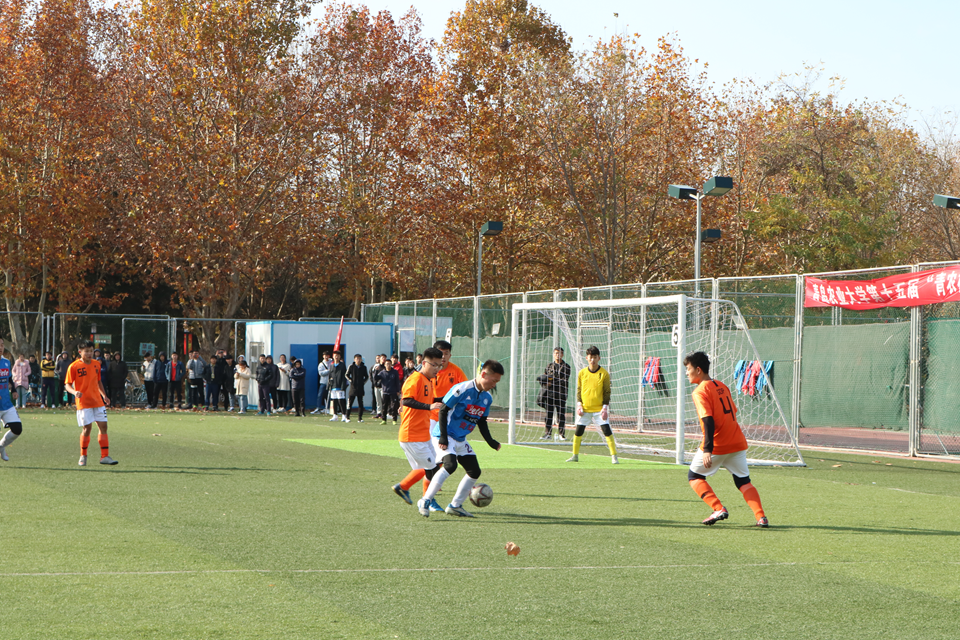 随着主裁判的一声哨响,球员们迅速投入到比赛当中。比赛开始不久双方即展开凌厉攻势,随后比赛逐渐进入白热化阶段。秋日的绿茵场上,88858cc永利官网球员的飒爽身姿,英勇向前,与建筑与工程学院足球队奋勇对抗,为学院的荣誉尽自己的努力。场下,88858cc永利官网的啦啦队为场上的球员加油助威。比赛中建筑与工程学院率先进球,88858cc永利官网球员并未失落,奋勇反击。比赛后半段,88858cc永利官网球员凭借在对方禁区内制造的点球扳回一城。