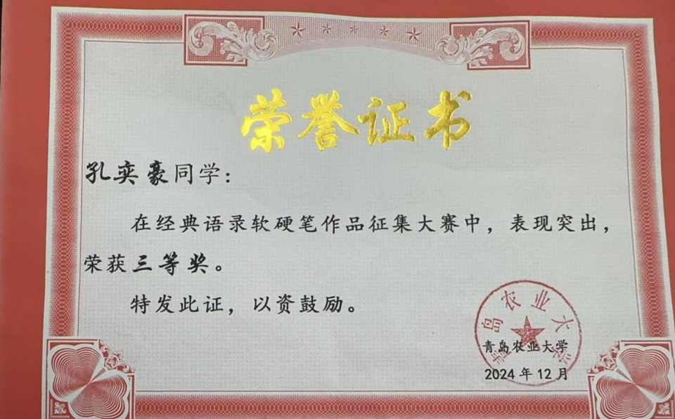 2025年4月23日,88858cc永利官网“第十八届读书节闭幕式暨第十九届读书节、第四届资源宣传节开幕式”在平度校区图书馆一楼报告厅顺利举行。在第十八届读书节中,88858cc永利官网教师秦鹏获评“借阅之星”,2024级农资环创新班学生孔奕豪在经典语录软硬笔作品征集大赛中荣获三等奖,展现了学院浓厚的书香氛围。